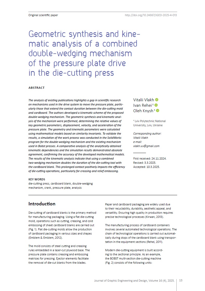 - Rehei, I. I., Vlakh, V. V., Knysh, O. M. & Mlynko, O. I. (2022) Complex analysis of the pressure plate drive mechanisms functioning in die-cutting presses. Printing and Publishing. 2 (84), 88–98. Available from: doi: 10.32403/0554-4866-2022-2-84-88-98