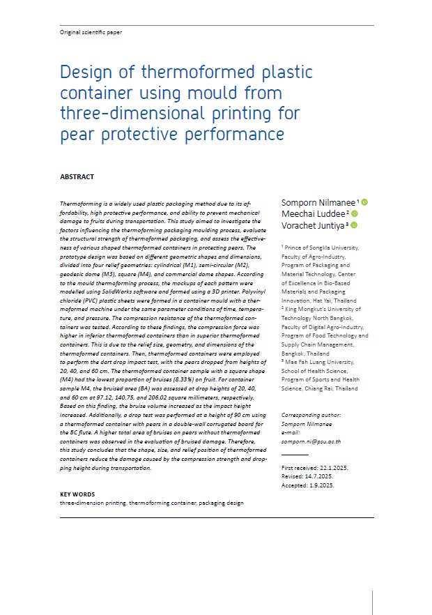 Thermoforming is a widely used plastic packaging method due to its affordability, high protective performance, and ability to prevent mechanical damage to fruits during transportation. This study aimed to investigate the factors influencing the thermoforming packaging moulding process, evaluate the structural strength of thermoformed packaging, and assess the effectiveness of various shaped thermoformed containers in protecting pears. The prototype design was based on different geometric shapes and dimensions, divided into four relief geometries: cylindrical (M1), semi-circular (M2), geodesic dome (M3), square (M4), and commercial dome shapes. According to the mould thermoforming process, the mockups of each pattern were modelled using SolidWorks software and formed using a 3D printer. Polyvinyl chloride (PVC) plastic sheets were formed in a container mould with a thermoformed machine under the same parameter conditions of time, temperature, and pressure. The compression resistance of the thermoformed containers was tested. According to these findings, the compression force was higher in inferior thermoformed containers than in superior thermoformed containers. This is due to the relief size, geometry, and dimensions of the thermoformed containers. Then, thermoformed containers were employed to perform the dart drop impact test, with the pears dropped from heights of 20, 40, and 60 cm. The thermoformed container sample with a square shape (M4) had the lowest proportion of bruises (8.33%) on fruit. For container sample M4, the bruised area (BA) was assessed at drop heights of 20, 40, and 60 cm at 97.12, 140.75, and 206.02 square millimeters, respectively. Based on this finding, the bruise volume increased as the impact height increased. Additionally, a drop test was performed at a height of 90 cm using a thermoformed container with pears in a double-wall corrugated board for the BC flute. A higher total area of bruises on pears without thermoformed containers was observed in the evaluation of bruised damage. Therefore, this study concludes that the shape, size, and relief position of thermoformed containers reduce the damage caused by the compression strength and dropping height during transportation.