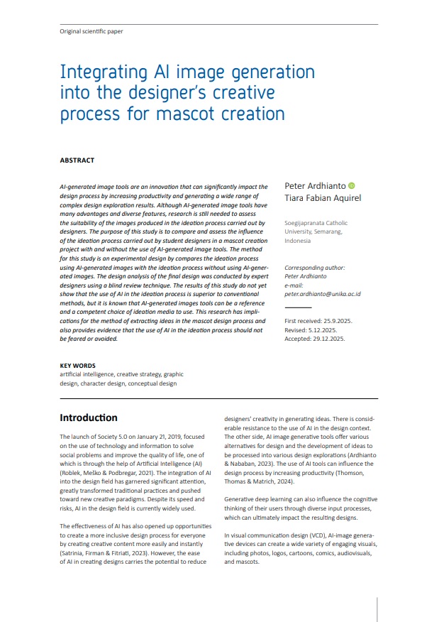 - Ardhianto, P. & Nababan, R. S. (2023) Artificial Intelligence Approach in Visual Design Ideation Process. In: Proceedings of the Fifth International Conference on Arts and Design Education, ICADE 2022, 22 September 2022, Virtual Conference. Dordrecht, Atlantis Press. pp. 112–117. Available from: doi: 10.2991/978-2-38476-100-5_17