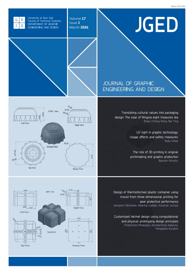 Journal of Graphic Engineering and Design is dedicated to publishing novel research and papers in the fields of graphic engineering, Prepress, Press, Postpress, Packaging, Colour and quality management, 3D printing, Functional printing, Material and measurement science, Ecology and waste management, Visual perception, Visual communications and media, Electronic publishing and new media, Graphic design, Industrial and product design, Typography, Photography.